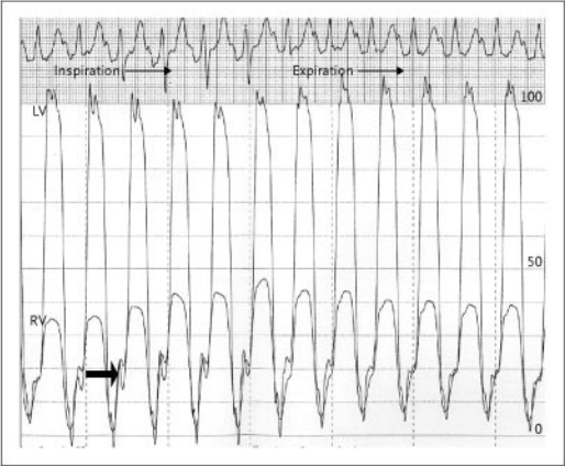 Figura 3. Trazado hemodinámico simultáneo de presiones de ventrículo derecho (RV) y ventrículo izquierdo (LV), mostrando discordancia de las presiones sistólicas durante la respiración (flechas finas), e igualación de las presiones diastólicas (flecha gruesa).